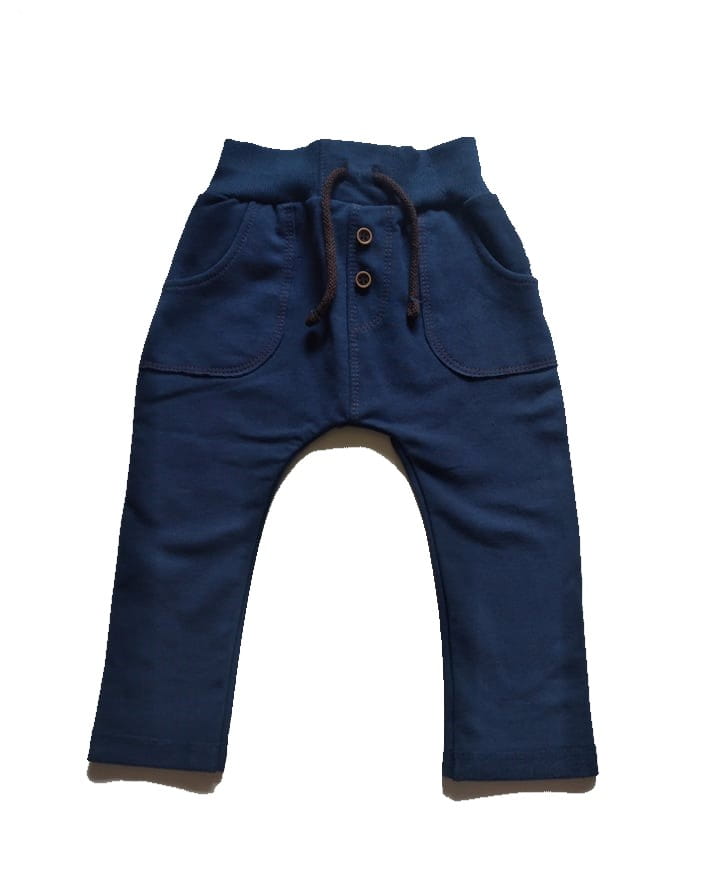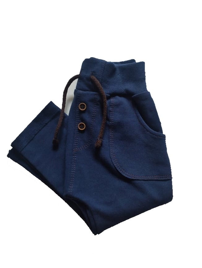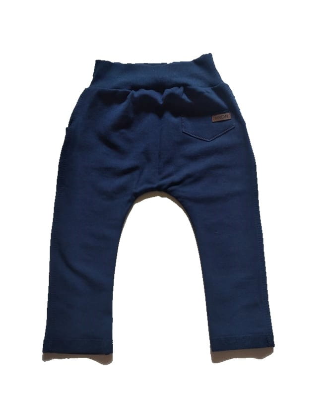 Świetne spodnie dresowe polskiej marki mrofi dla chłopca, spodnie w granatowym kolorze z bocznymi kieszeniami i sznureczkiem w pasie, ozdobione guziczkami.