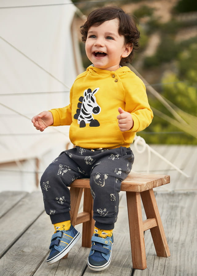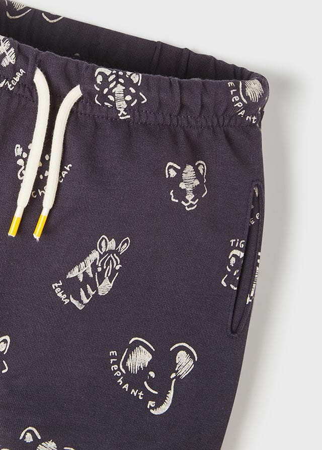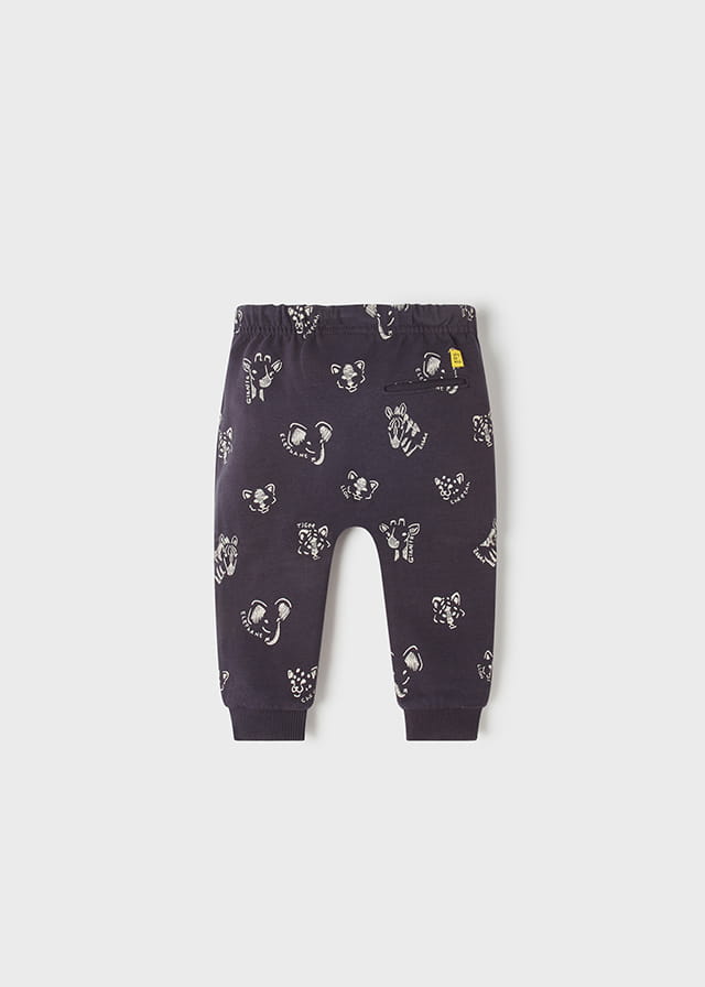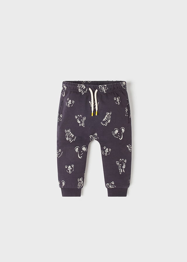 Świetne spodnie dresowe Mayoral dla chłopca w grafitowym kolorze z nadrukiem zwierzątek i sznureczkiem w pasie z możliwością regulacji.