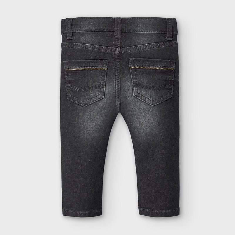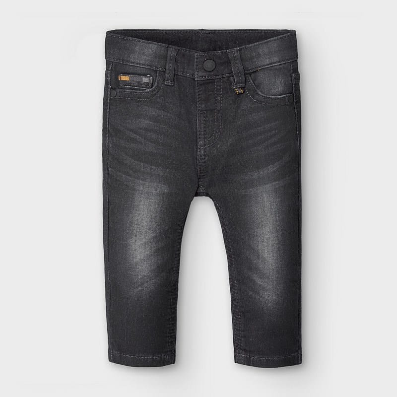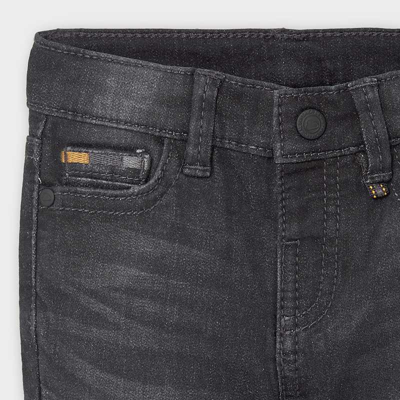 Świetne spodnie jeansowe Mayoral dla chłopca, w czarnym kolorze z efektem sprania, spodnie o kroju slim fit, z bocznymi i tylnymi kieszonkami, zapinane na zatrzask.