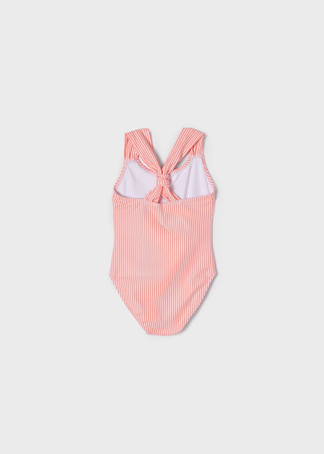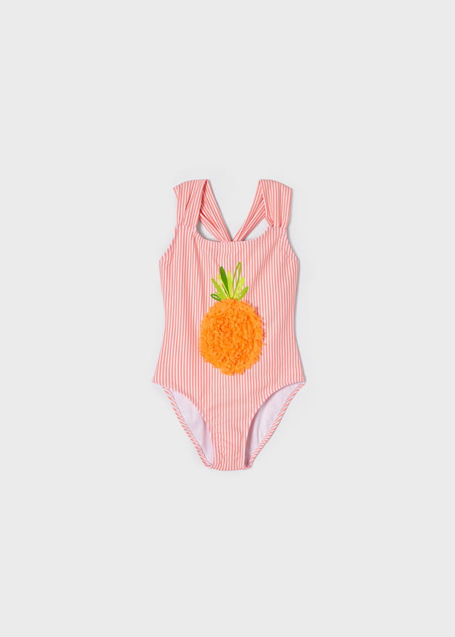 Śliczny strój kąpielowy Mayoral dla dziewczynki jednoczęściowy w paseczki z aplikacją ananasa, strój w różowym kolorze fluo.