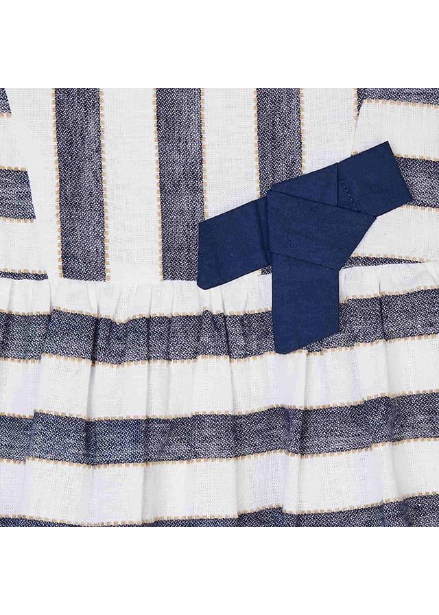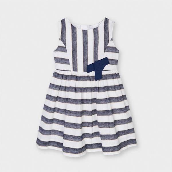 Piękna sukienka Mayoral dla dziewczynki w kremowo-granatowe paseczki z ozdobną kokardką w pasie. Sukienka na szerszych ramiączkach, zapinana z tyłu na kryty suwak.