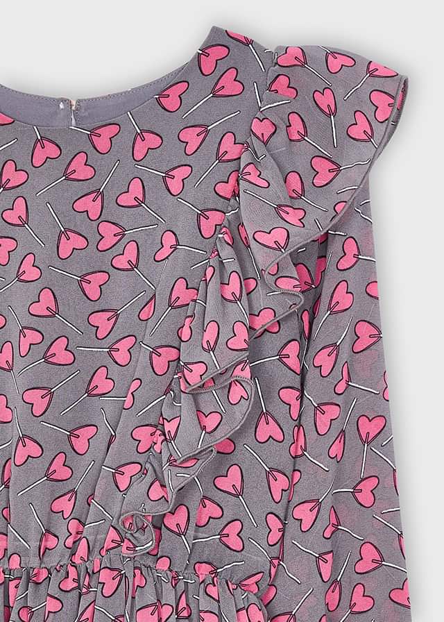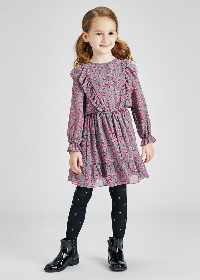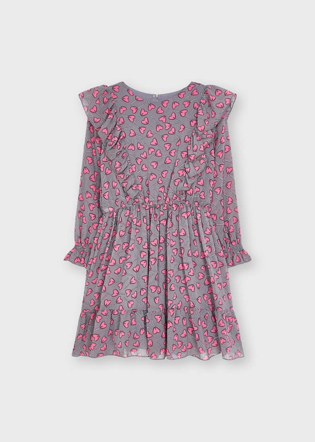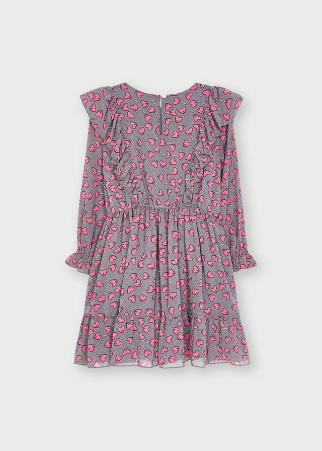 Śliczna sukienka szyfonowa Mayoral dla dziewczynki z nadrukiem serduszek, z lejącej gazy, bardzo lekka i przewiewna. Sukienka z długim rękawem, przy ramionach ozdobiona falbankami, zapinana z tyłu na guziczek.
