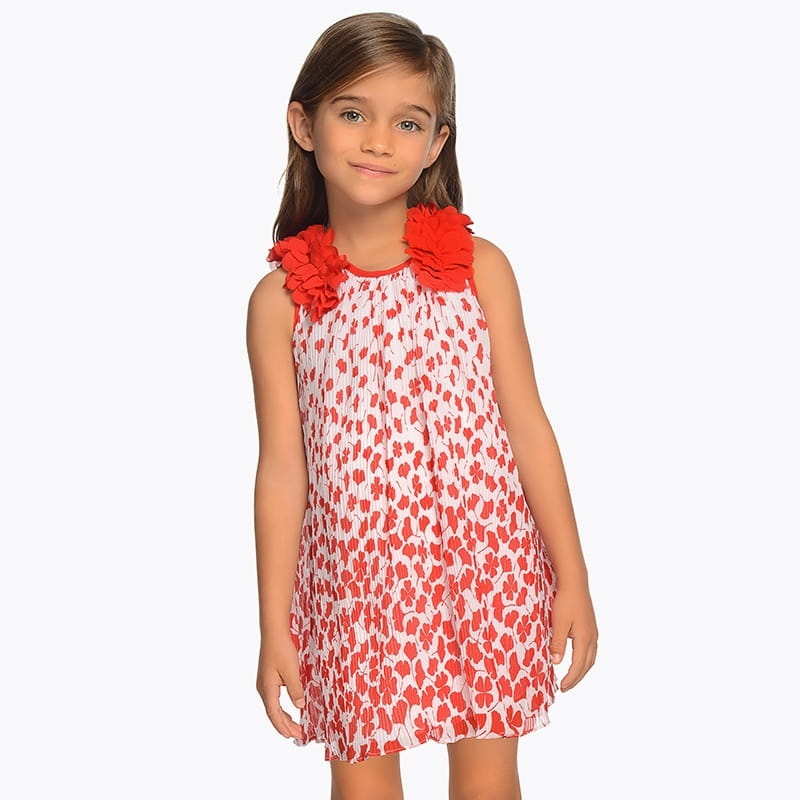 Śliczna sukienka Mayoral dla dziewczynki na ramiączkach ozdobionych płatkami kwiatów, sukienka biała z nadrukiem czerwonych kwiatuszków. Sukienka zapinana z tyłu na guziczek wykonana ze zwiewnej i lekkiej gazy.