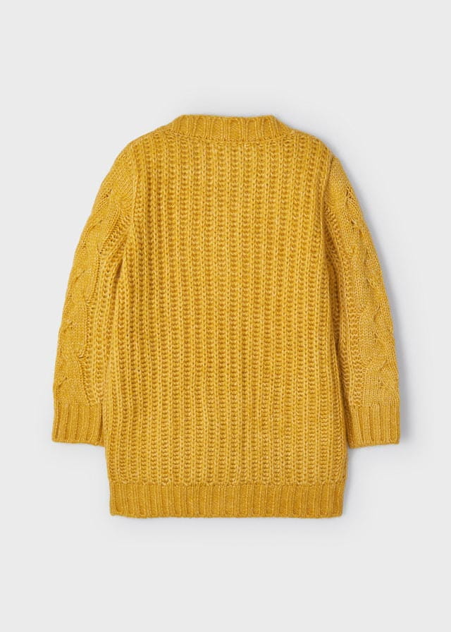 Świetny sweter Mayoral dla dziewczynki, trykotowy, sweter o dłuższym kroju, zapinany na guziki. Sweter ma ciekawy warkoczowy splot z przodu.