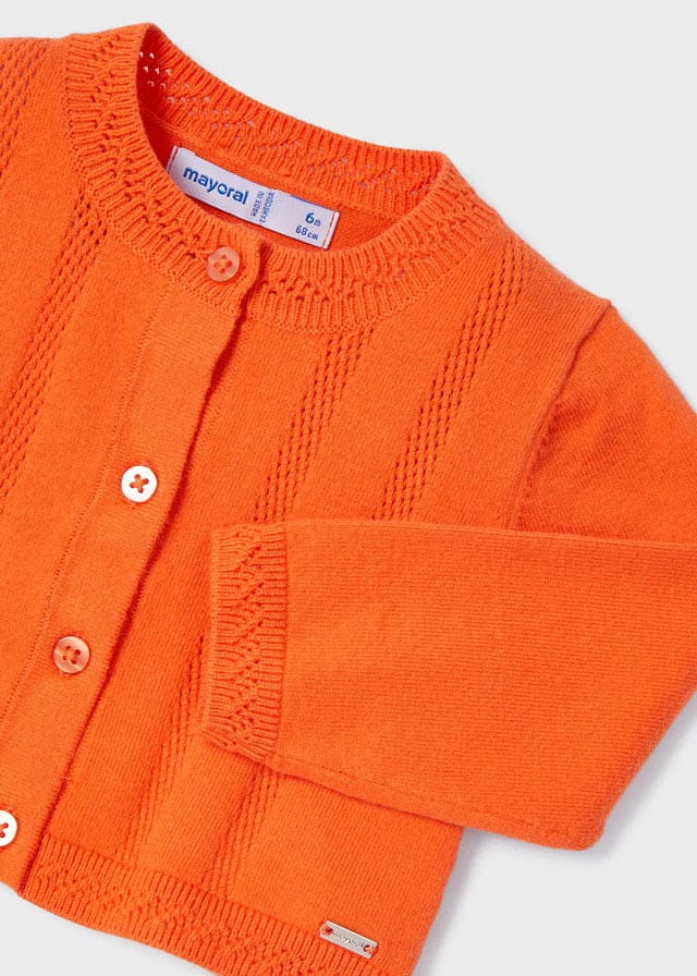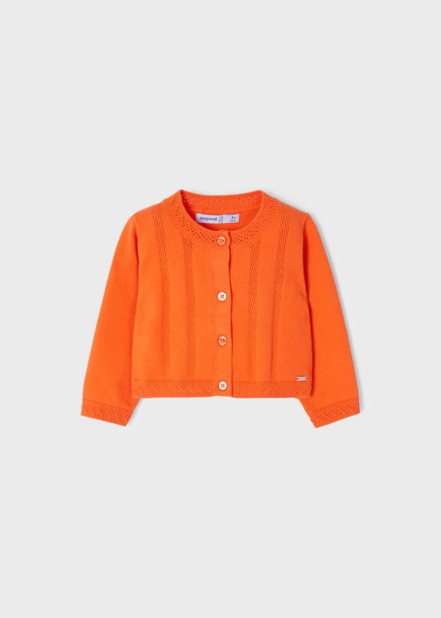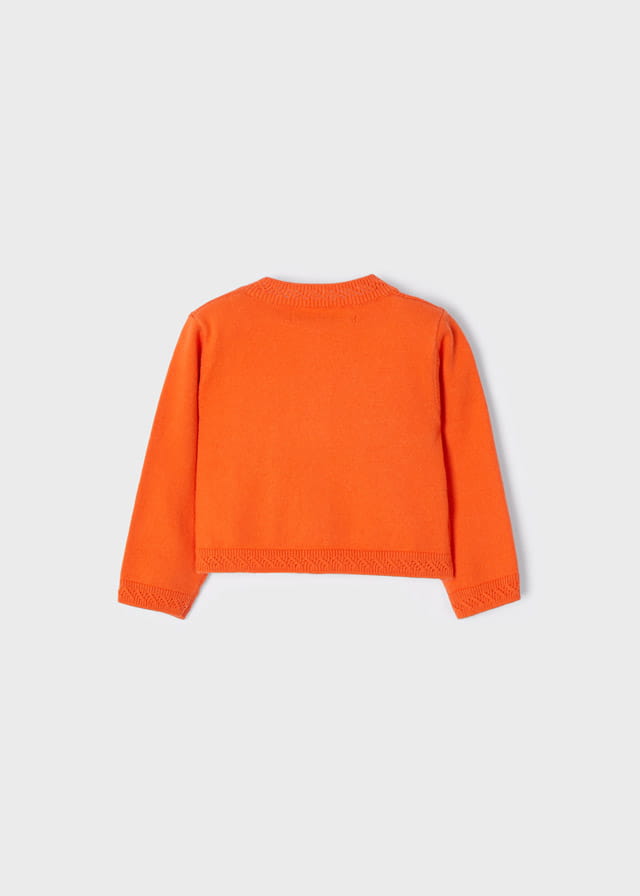 Piękny sweterek trykotowy Mayoral dla dziewczynki w pomarańczowym kolorze, zapinany na guziczki.