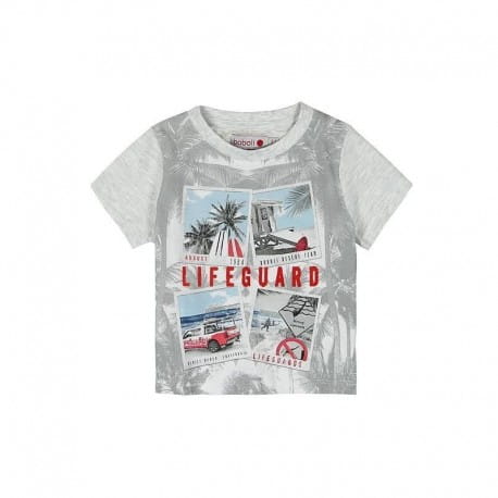 Świetna koszulka Boboli z krótkim rękawem, dla chłopca ze zdjęciami plaży i czerwonym napisem LIFEGUARD.