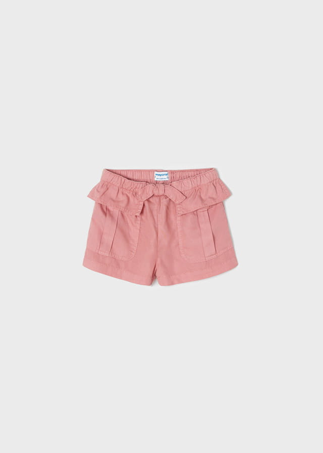 Świetne szorty Mayoral dla dziewczynki w bladym różu z bocznymi kieszeniami. Szorty na gumce w pasie, z ozdobną kokardką.