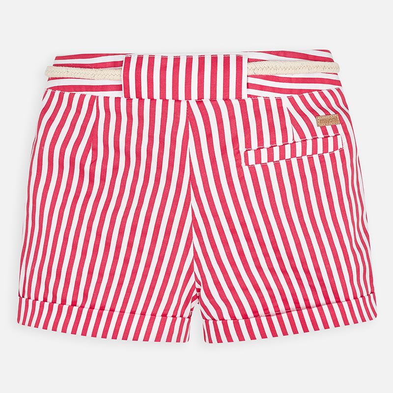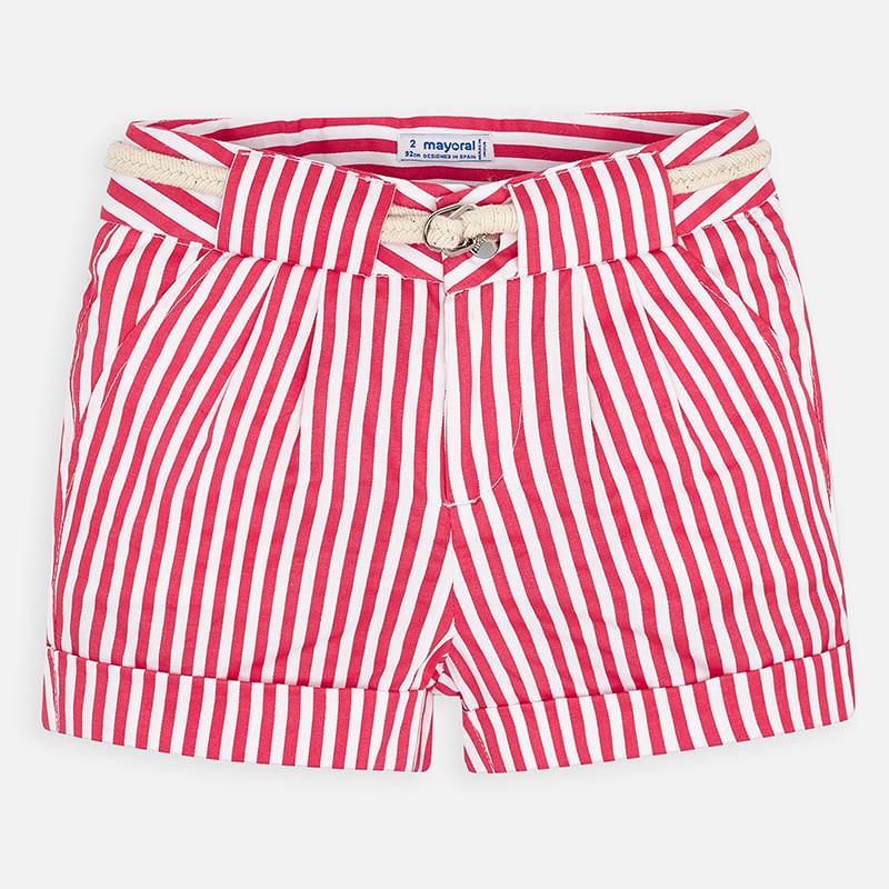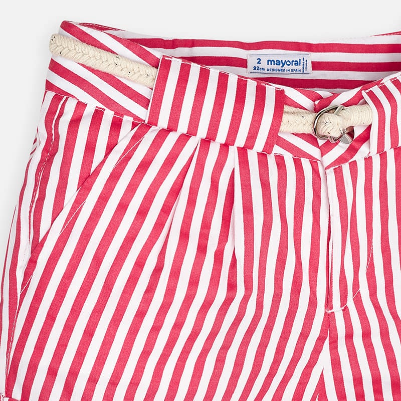 Śliczne szorty Mayoral dla dziewczynki z miękkiego materiału w paseczki, odwijane, z bocznymi kieszonkami i wyciąganym paseczkiem. Szorty zapinane na zatrzask, w pasie gumka z możliwością regulacji.