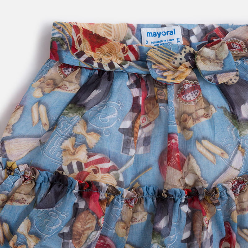 Świetna spódnica Mayoral dla dziewczynki z szyfonu, z kolorowym nadrukiem. Spódnica ma falbankę a w pasie kokardkę.